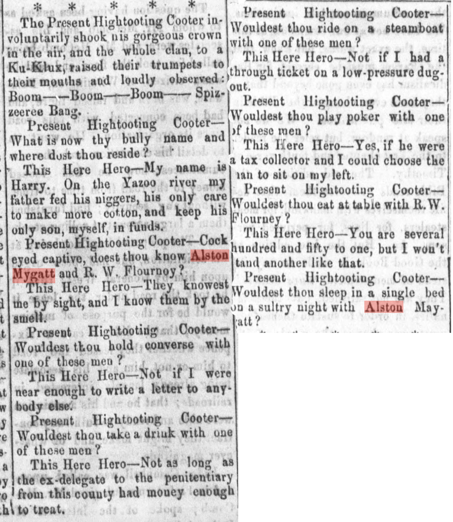 In July 7, 1868 issue of the Louisville Journal, it is reported, "Rev. Alston Mygatt, a prominent carpet-bagger is so thoroughly disgusted with the people of Mississippi for their action in the late election that he has determined to leave the State at once." The paper's is very anti-Negro and doesn't condemn violence against them by Whites. No evidence that Mygatt left the state. In fact he was elected to the state senate. The report was based on an article published in the Vicksburg Herald seen at right.