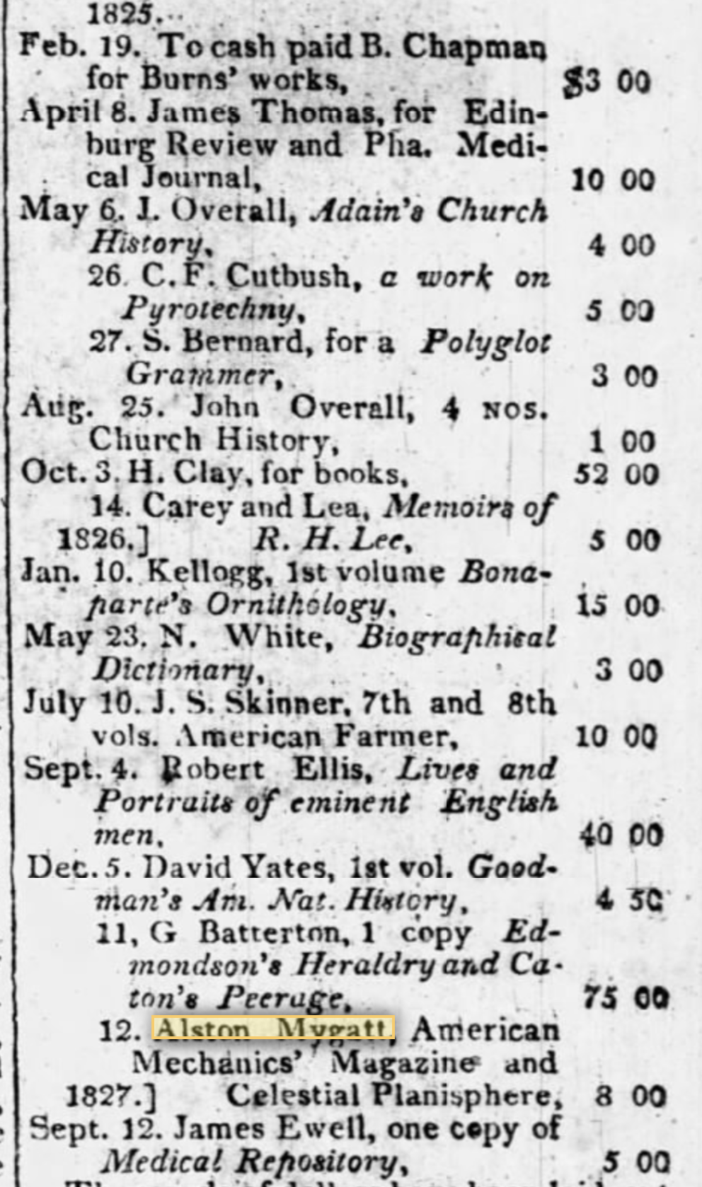Alston Mygatt traveled extensively across the South as evidenced by the large number of entries in newspapers announcing uncollected letters to him in various post offices. These occur during the 1820s, 1830s and 1840s. He presumably was selling subscriptions to Jared Sparks' books.