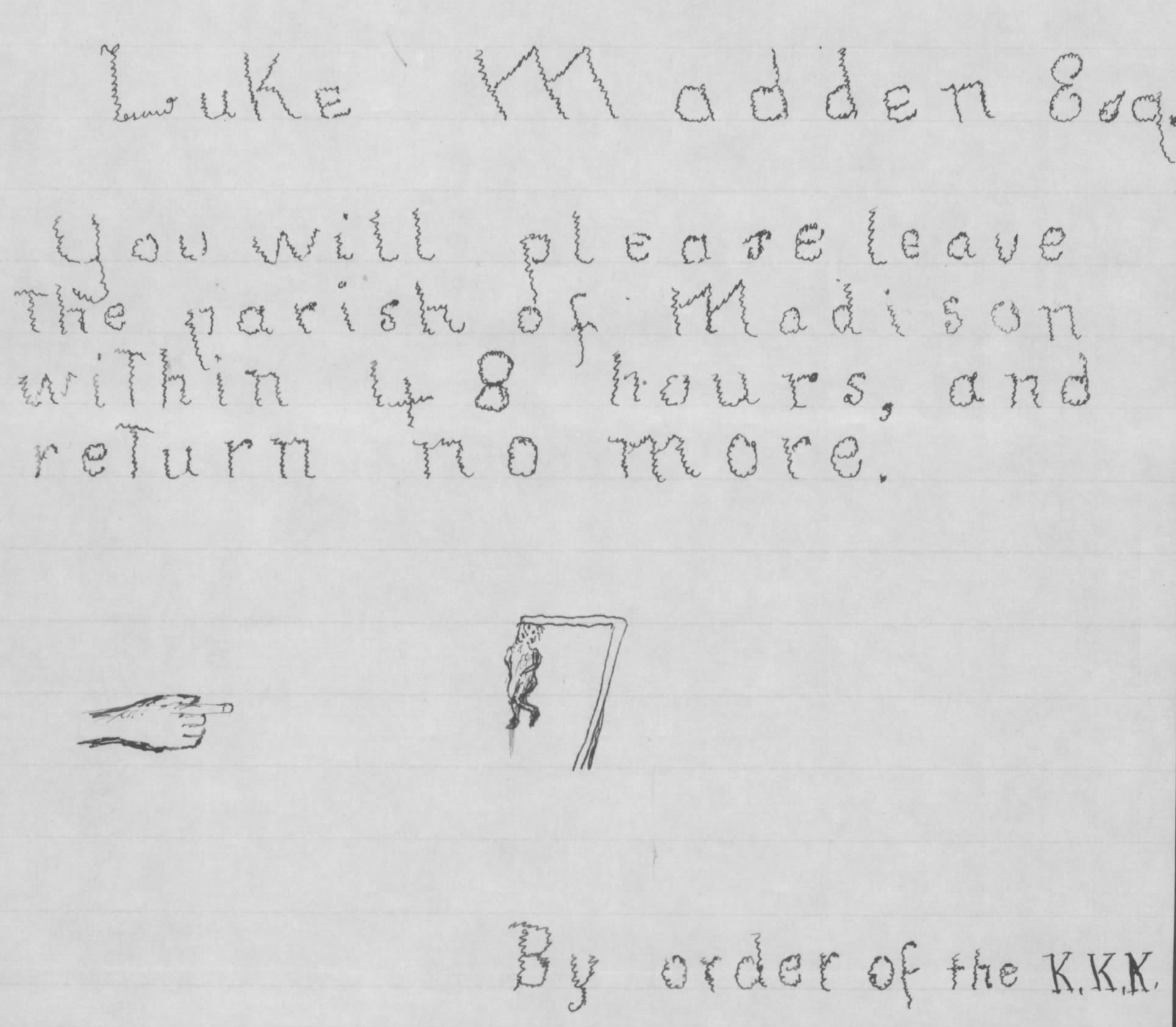 Madden had received this threat from the KKK. Hightly likely that Mygatt received similar threats.