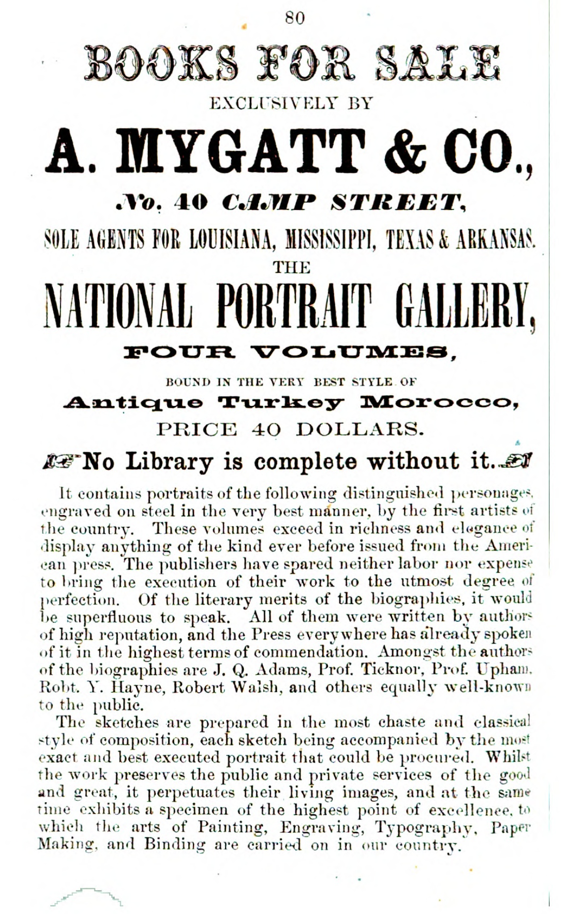 In May of 1859, the fixtures of Mygatt's book and stationary store are sold at public auction to pay debts owed his creditors. The store address is 40 Camp Street, New Orleans, which does not match that at 15 Camp Street, which appears in most of his ads. Camp Street would have be a good business address since only a few block from riverfront. 40 Camp St. today is at the crossing with Canal Street.
