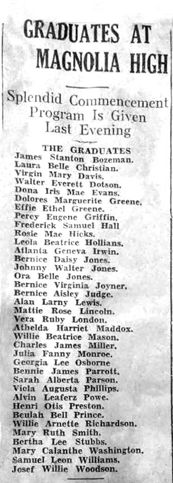 May 17, 1921—Vicksburg Evening Post reports commencement exercises for students at the Cherry Street Colored School. Myrtle Estella Shannon, granddaughter of teacher George Washington Stith is a graduate. The class performs the play, The Princess by Alfred Lord Tennyson. Magnolia Avenue also has it closing exercises. They preform scenes from As You Like It by William Shakespeare.