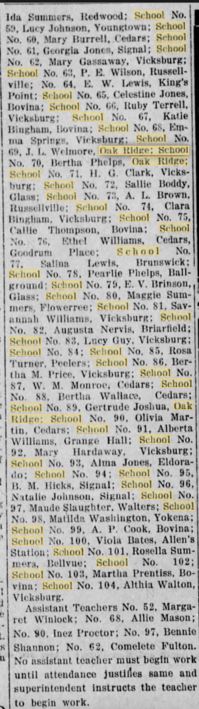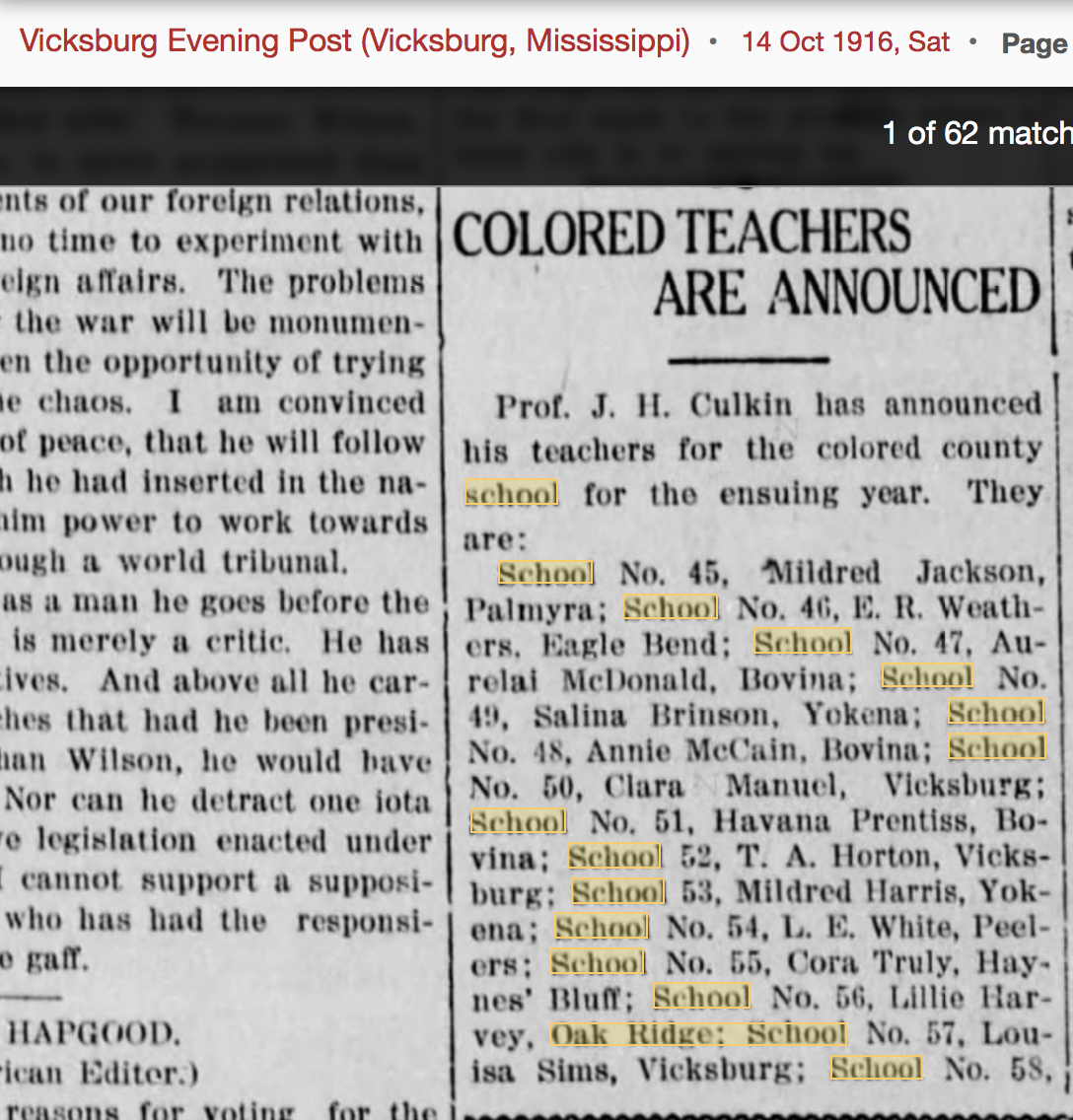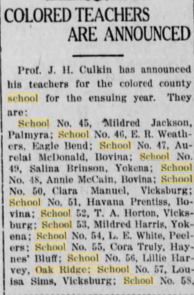 March 11, 1921—Vicksburg Evening Post publishes Schools Financial statement by Superintendent J. H. Culkin. Nine white schools are mention with a total budget for them approximately five times that of the colored school. Oak Ridge has the largest budget at $13,405.9. The portion of the report related to Colored Schools follows:
