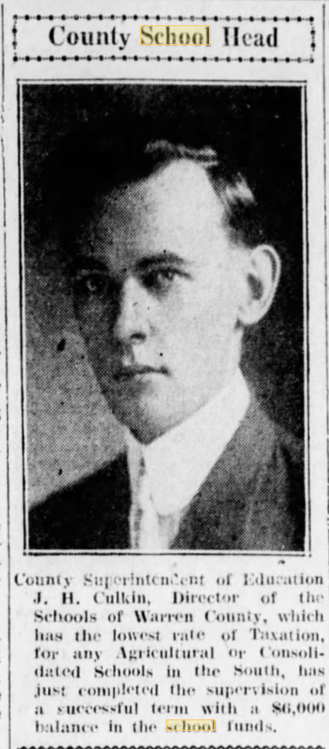 March 11, 1921—Vicksburg Evening Post has an article written by School Superintendent J. H. Culkin, entitled "Article Concerning Our Colored Schools". He assures the citizens that no money will come from the existing school budget to support the grant from the Julius Rosenwald Fund which will fund the construction of 15 colored schools. The schools will be strictly industrial. Farming, carpenter work, industrial and manual training features form the basis of all activities. "Under no circumstances, will there be any conveyances for the purpose, there being no necessity for same." Supt. Culkin continues, "The whole proposition is an economic. These schools can be made the means of retaining our present labor supply and will assist in recalling many of the negroes who have left Warren county. He supports his argument, "Since the county will pay only about 10 percent of the entire cost of these buildings or about $7,000, and in all probabilities very much less, it being assumed that these schools might be the means of retaining only seven families for 10 years. Assuming that each of the families would have an earning power of as low as $200 per year, the amount of money invested would be regained."