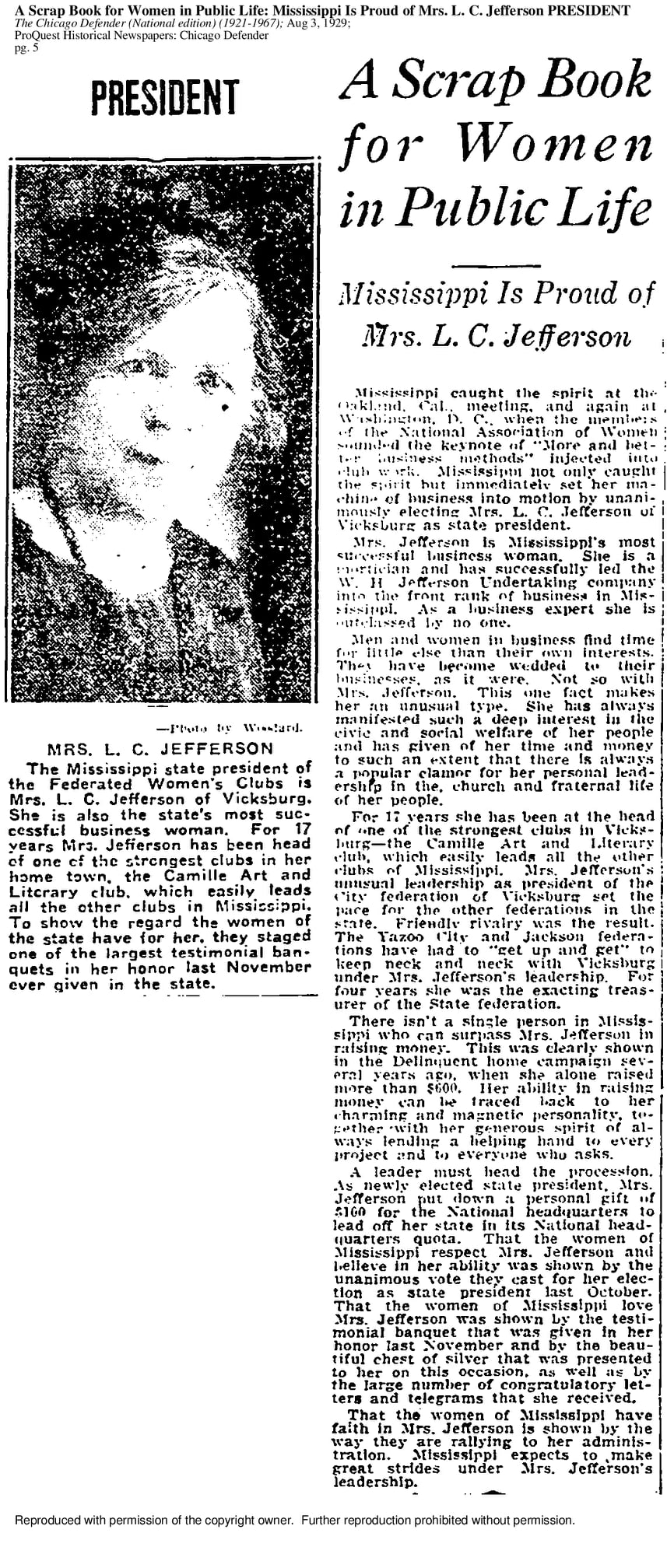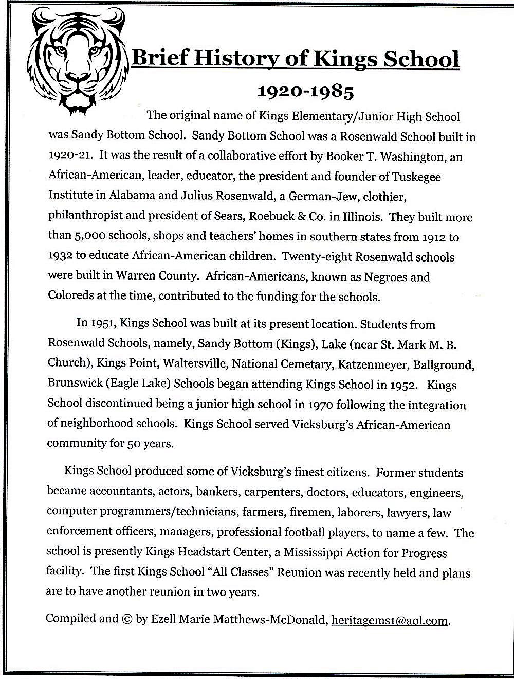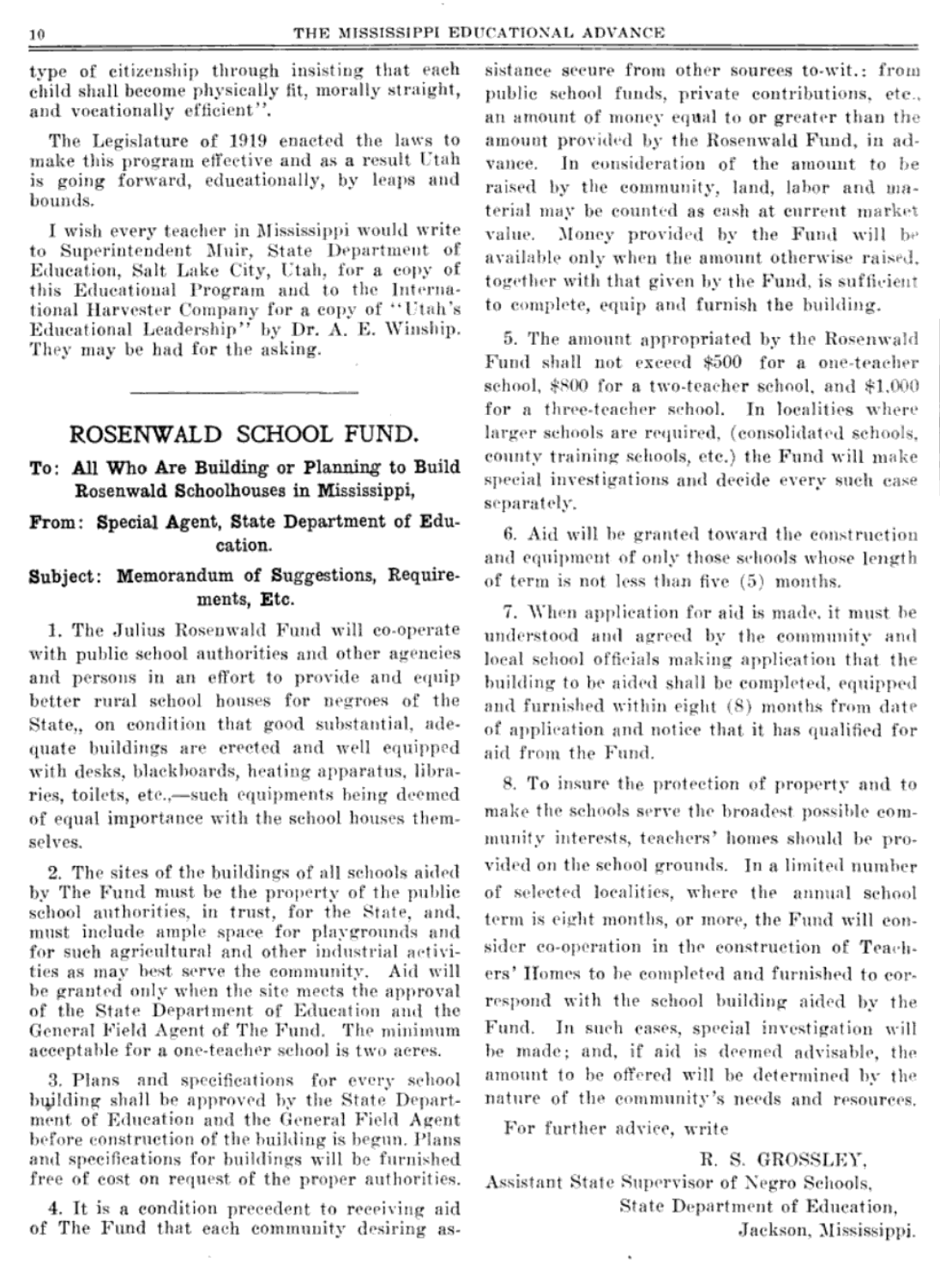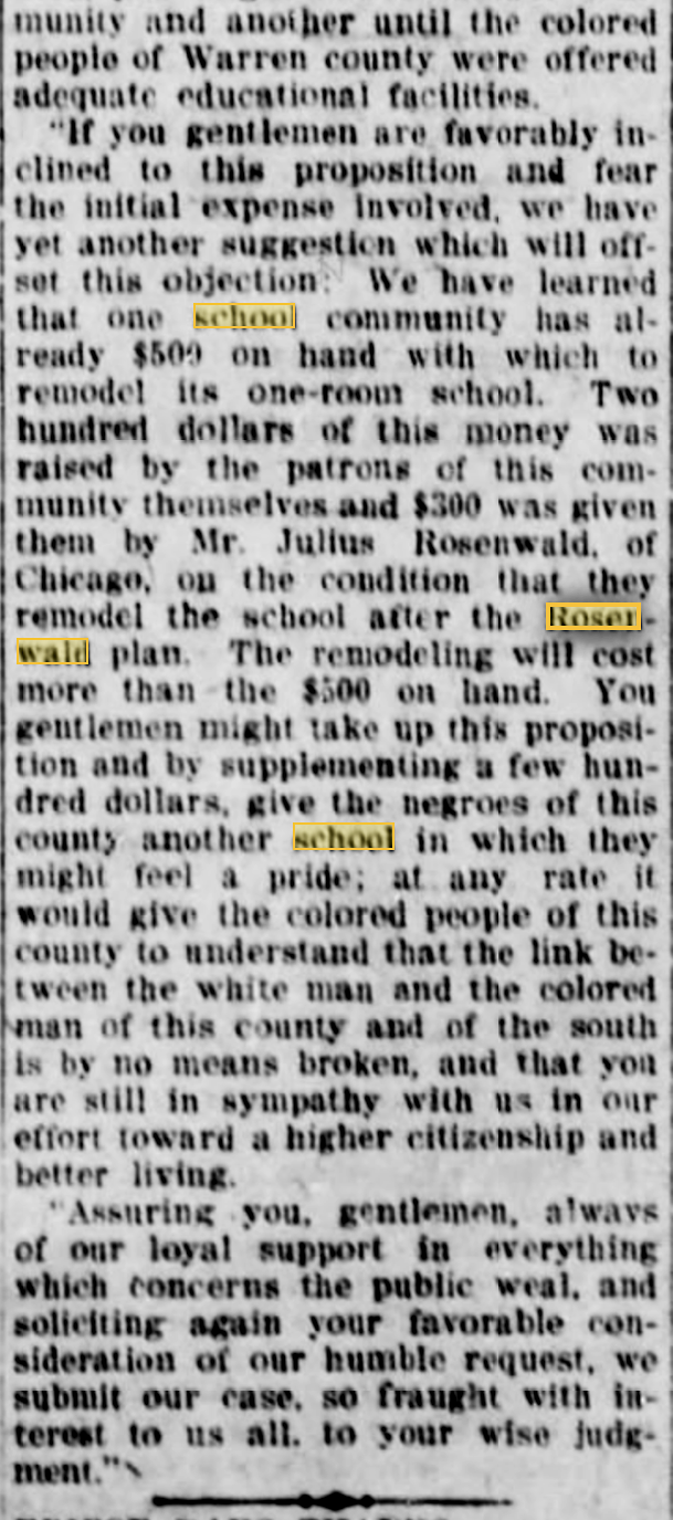 December 6, 1920—Vicksburg Evening Post reports that Superintendent of Schools for Warren county has secured an additional $5000 from the Rosenwald Fund which has given $52,000 to the state. He justifies the effort to improve Negro school as necessary to keep "producers" from leaving the county. He says this is the most successful educational effort during his tenure.