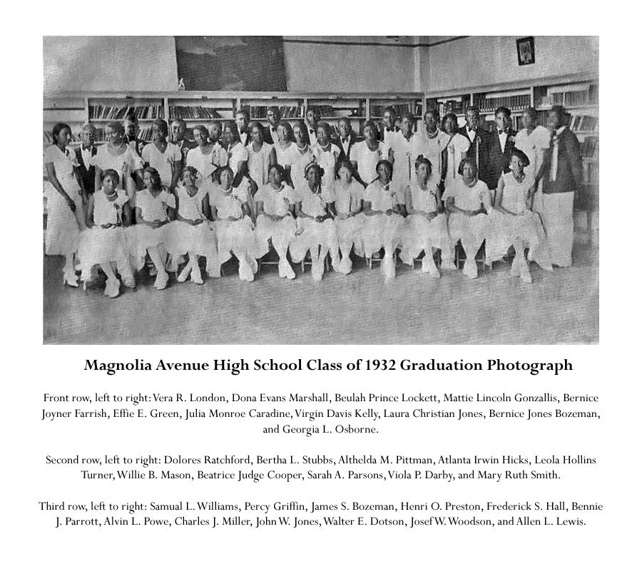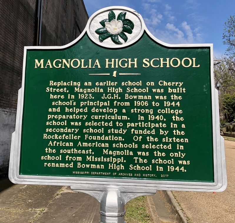 1923–Replacing an earlier school on Cherry Street, Magnolia High School was built here in 1923. J.G.H. Bowman was the school's principal from 1906 to 1944 and helped develop a strong college preparatory curriculum. Professor Bowman is seen in the upper right of the photo at right. In 1940, the school was selected to participate in a secondary school study funded by the Rockefeller Foundation. Of the sixteen African-American schools selected in the southeast, Magnolia was the only school from Mississippi. The school was renamed Bowman High School in 1944.