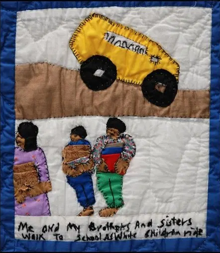 For many years, I have sought information about early African-American schools in rural Warren county. I attended school in the county between 1942–1954 and did not remember any such schools until one was built 1951 not far from where we lived. My memories are of African-American children walking to school in all kinds of weather while we were on a dry school bus. They carried the books that were determined to be of too poor condition to be used in white schools. These children from time to time would be pelted with various objects from cars driving by. The culprits were usually teenage boys. (See the panel from Master Mississippi quilter, Hystercine Rankin (1928–2010). Caption reads "Me And My Brothers And Sisters Walk To School As White Children Ride.")