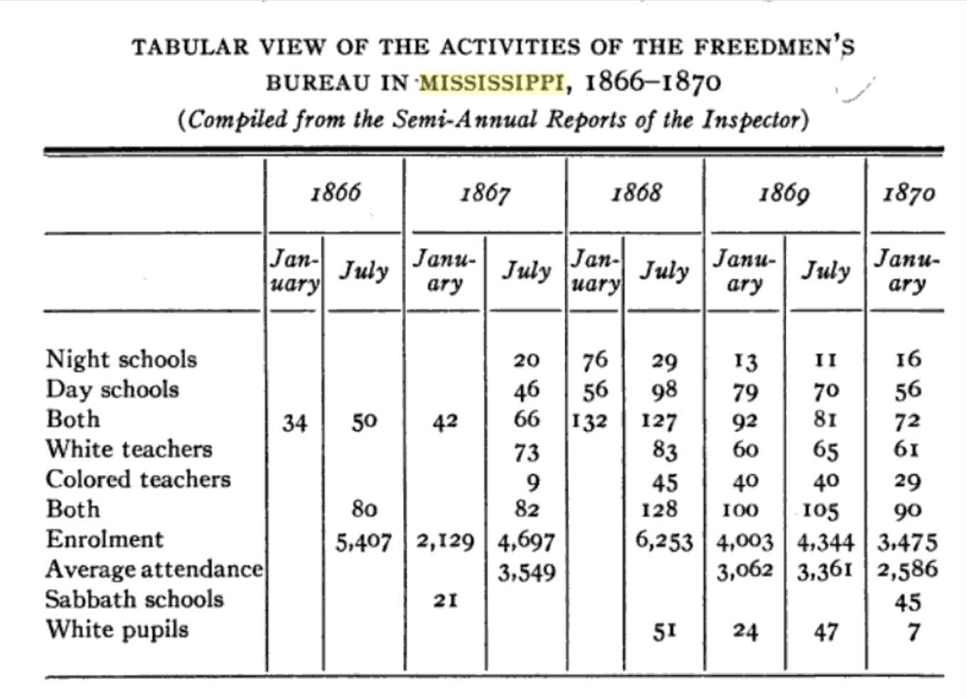 1870—According to John R. Lynch in "The Facts of Reconstruction", "There was not a public school buildng anywhere in the state except in a few of the larger towns, and they, with possibly a few exceptions, were greatly in need of repairs." The table below provides some information about schools in Mississippi before 1870. In 1871, there were only 4 African-American high schools, 51 grammar schools and 202 mixed grades schools in MS.