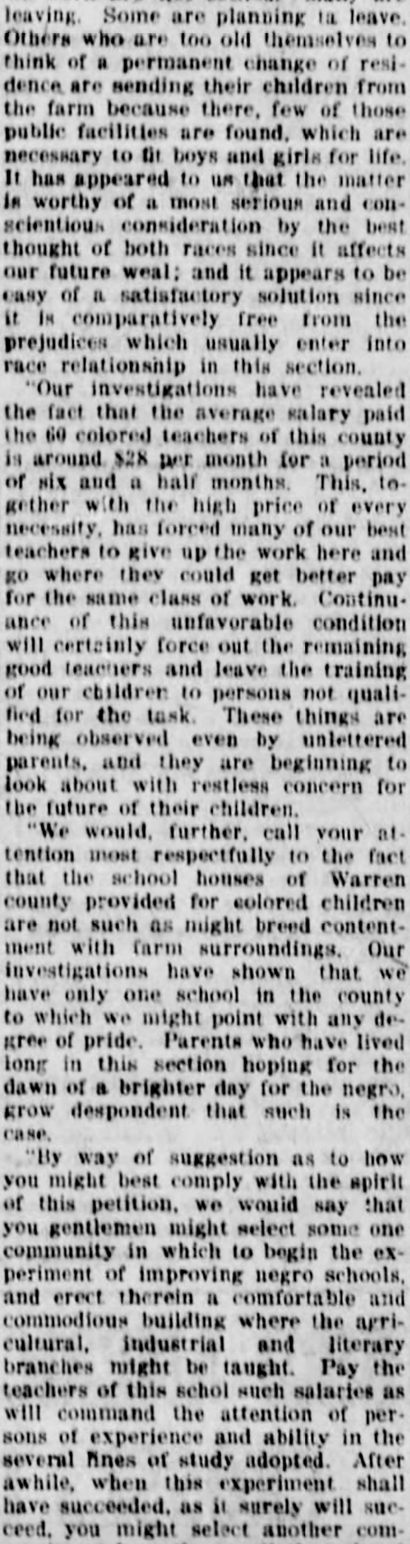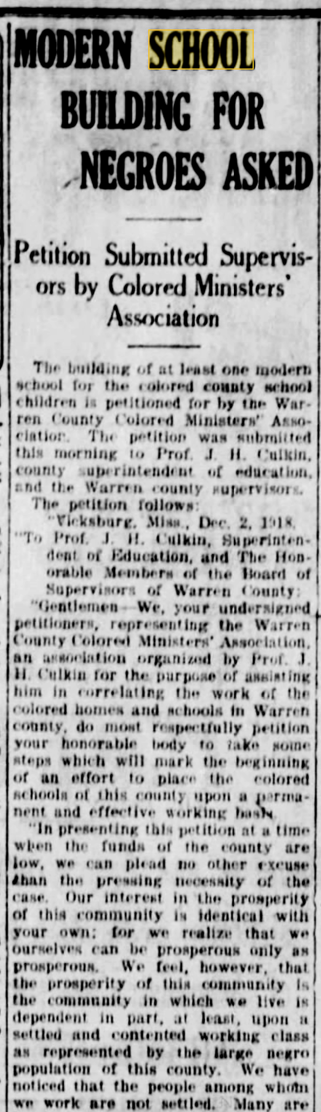 December 2, 1918-Vicksburg Evening Post publishes letter from Negro Ministers asking for modern school. The article mentions 60 colored school teacher and their average salary of $28/month for 6 1/2 months. They suggest the Rosenwald fund to begin with modernizing one school. The letter was signed, however the Post did not publish their names, likely to prevent any harassment.