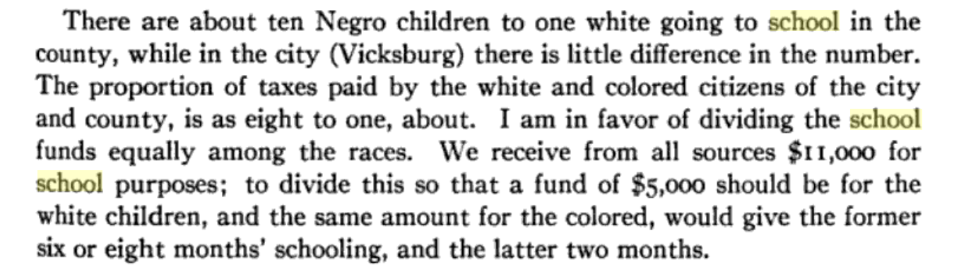 "After the Civil War, in 1868, Mississippi held its first constitutional convention in which African Americans were allowed to participate. Their breakthrough constitution created 'a uniform system of free public schools' for those ages 5 to 21, and divided school funds evenly among all children of school age. But many policymakers rebelled against white taxpayers paying anything toward the education of black students. The state superintendent of education called the creation of public schools 'an unmitigated outrage upon the rights and liberties of the white people of the state.'