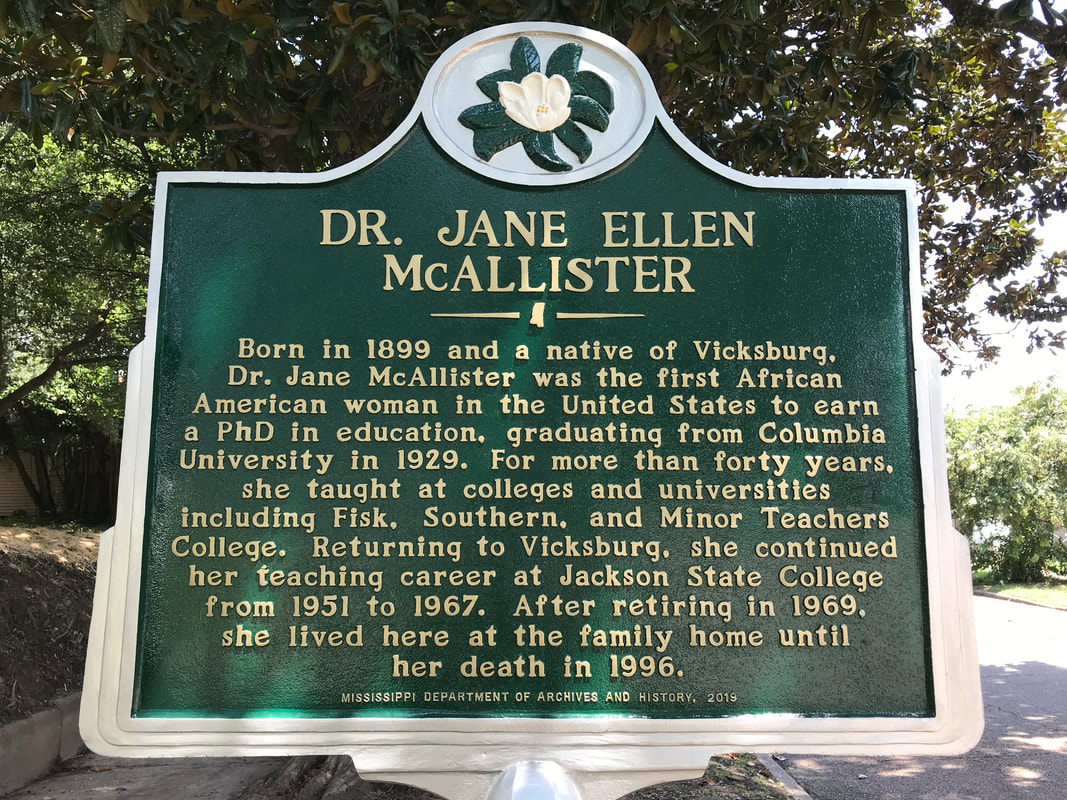 The McAllister home marker is sponsored by the city of Vicksburg. Dr. Jane McAllister was born in Vicksburg in 1899. Her father worked as a mail carrier, and her mother was a schoolteacher. McAllister graduated high school at 15, and four years later graduated from Talladega College in Alabama in 1919, where she became the youngest Talladega graduate by earning her degree at the age of 19. In 1929, she became the first African-American woman to earn a Ph.D. from Columbia University. She taught psychology and education at Southern University in Baton Rouge, Louisiana, Grambling State University in Grambling, Louisiana, Fisk University in Nashville Tennessee, Virginia State University in Petersburg, Virginia, and Dillard University in New Orleans, Louisiana, and other schools until her retirement in 1970. Dr. McAllister died in January 1996, at the age of 96.
